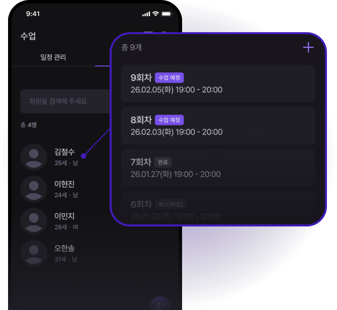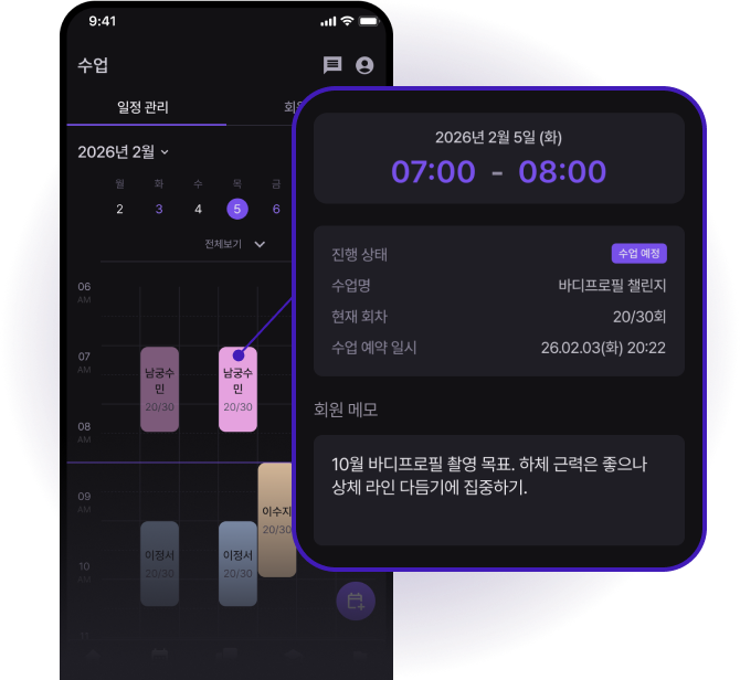 캘린더를 통해 수업 일정과 남은 회차, 회원 메모를 한 눈에 파악할 수 있어요