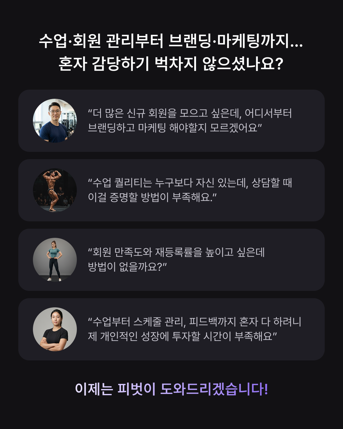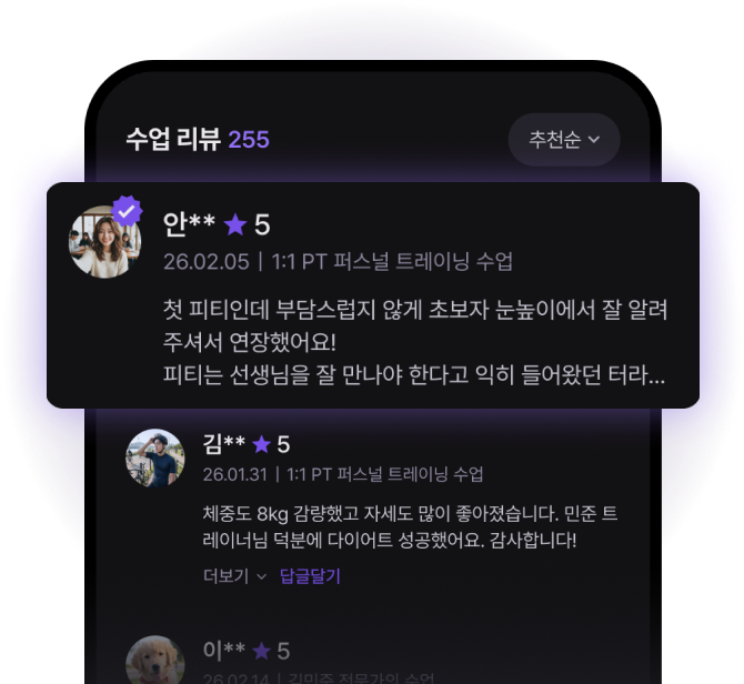 과거 회원들의 리뷰를 수집하고, 현재 수업 회원만 남길 수 있는 인증 리뷰로 신뢰도를 높일 수 있어요.