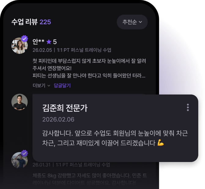 회원 리뷰에 정성스러운 답글을 남겨 보세요. 기존 회원의 재등록률은 물론, 신규 회원 등록률까지 올라갑니다.