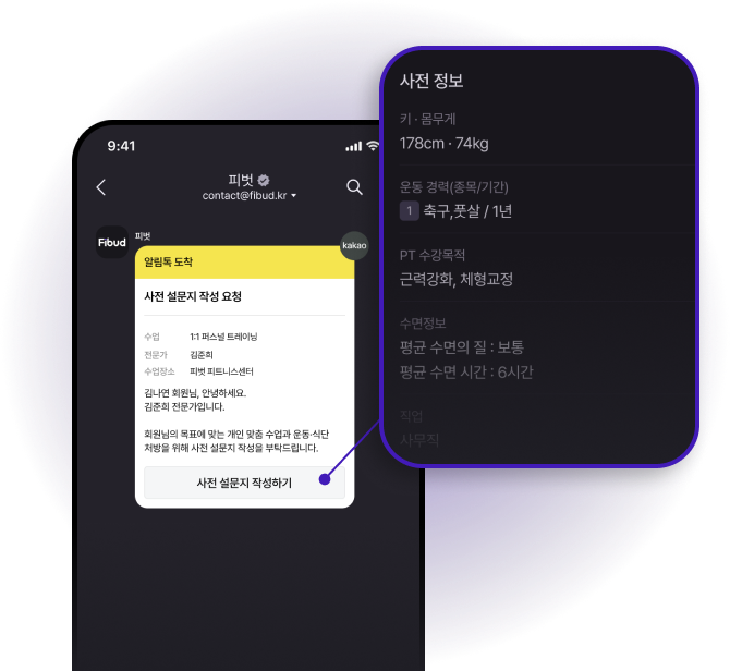 나이·키·몸무게부터 운동 경력·직업·병력까지 카톡으로 간편하게 사전 설문을 요청하고 받을 수 있어요